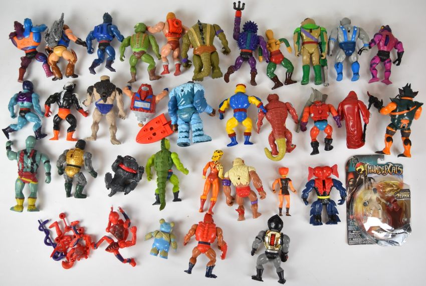 Thirty three vintage Masters of the Universe and Thundercats figures by Mattel and LJN to include characters He-Man, Skeletor, Whiplash, Rio Blast, Mantenna, Stinkor, Two Bad, Modulok, Hordak, Spikor, Mumm-Ra, Panthro, Cheetara, Wilykat, Monkian, Ratar-O, Snowman of Hook Mountain, Vultureman, Berbil Bert, Tuska Warrior and Ma-Mutt.
