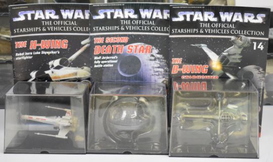 Twenty three Star Wars - DeAgostini 'Official Starships and Vehicles Collection' diecast models to include The Millennium Falcon, AT-AT, Y-Wing, Snowspeeder, Tie Interceptor, Star Destroyer and Slave 1, in original display boxes with accompanying booklets.