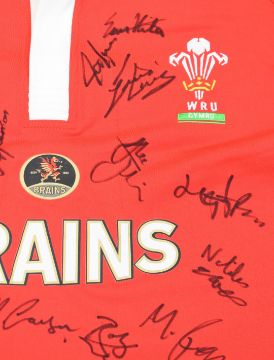 Welsh Rugby Union vintage signed replica child's size national home Wales shirt with presentation inscription and autographed by four players including Phil Bennett OBE and Arthur Lewis and a multi signed replica adult's Wales shirt autographed by twenty five players in bold ink  (2)