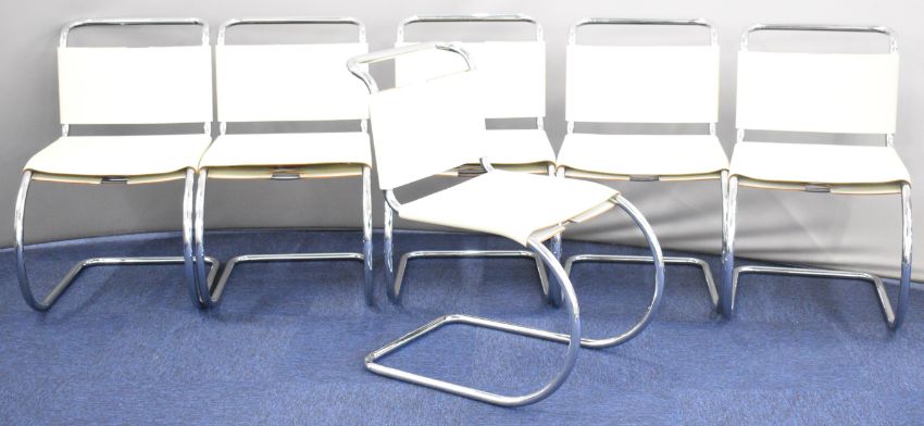 Set of six Knoll Studio chrome and leather designer dining chairs with stitched leather backs some with Matricola labels, W47 x D75 x H80cm