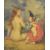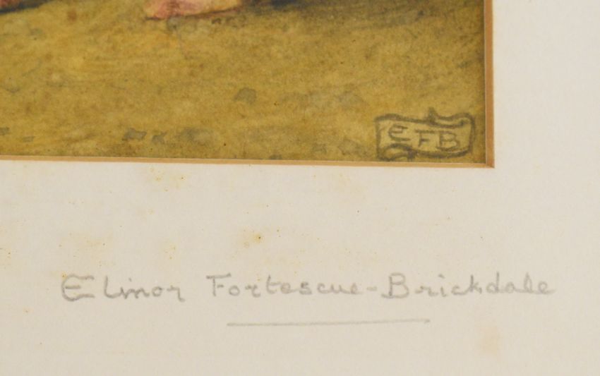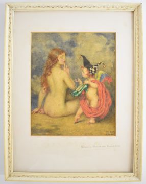 Eleanor Fortescue-Brickdale (1872-1945) watercolour Pre-Raphaelite style study of a nude lady seated with a winged cherub wearing a jester's or similar hat and holding a flowing red robe, green shoes and a blue necklace, monogrammed lower right, 18.5 x 15cm, in white painted frame