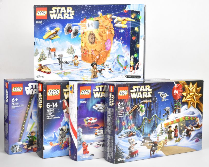 Five Lego Star Wars Christmas Advent Calendars comprising set numbers 75366, 75279, 75213, 75395 and 75146, all in factory sealed boxes.