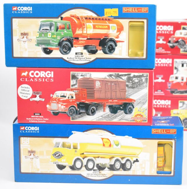 Eleven Corgi Classics diecast model haulage vehicles comprising seven British Rail related trucks and four Shell/BP tankers, all in original boxes.