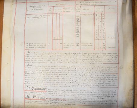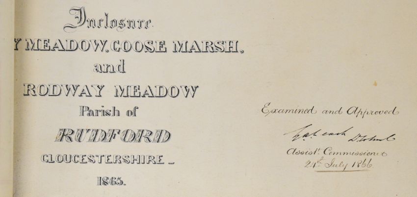 [Map] Inclosure Key Meadow, Goose Marsh and Rodway Meadow in the Parish of Rudford, Gloucestershire 1865, scale three chains to an inch with signature of the assistant commissioner 24th July 1866 and certified by the Inclosure Commissioners a coloured map showing the river Leadon from the Hamlet of Highleadon through parishes of Hartpury and Rudford to Churcham and Lassington, linen backed, with three vellum sheets attached with the report and findings of the Land Surveyor Josiah Castree Jnr of College Green, Gloucester, 60 x 140cm