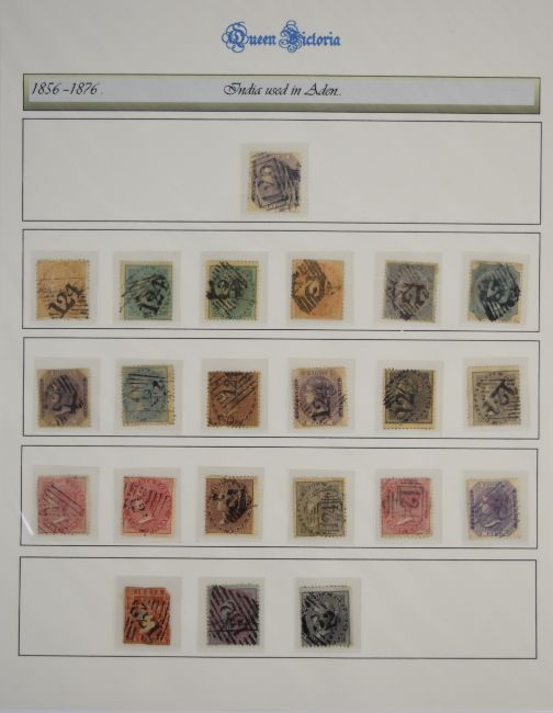 1856-76 India stamps used abroad, Aden and Abyssinia showing a variety of postmarks, displayed on three album pages