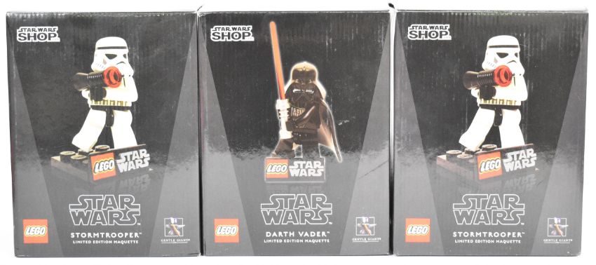 Three Lego Star Wars limited edition maquette models by Gentle Giant Ltd, comprising Darth Vader (587/1000), Stormtrooper (248/1000) and Stormtrooper with additional Han Solo head (47/1000), all in original boxes with numbered certificates of authenticity.