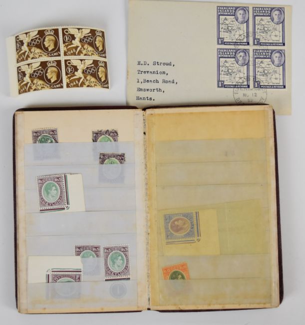 GB, Commonwealth and world stamp collection including small album GB 1d reds etc, GB and world covers including airmail, GB and CW blocks including 1948 £1 RSW, 1935 Silver Jubilee 2/- booklet, Windsor album including three 1d blacks, 1840 2d blue line engraved and surface printed, lilacs and greens, 1887 £1 green and 1929 £1 PUC used range of postage dues and official o/prints, Brit occupation of Italian colonies, small stockbook with mint CW including King George VI Falklands 1952 to £1 mint, Brunei to $5 and Malaya states mint, Simplex album with used Falklands with 1938 and 1952 DEFs sets on cover to £1, 1938 set mint to £6, 1935 Silver Jubilee M and U and 1948 RSW £1 mint, small stock album of CW stamps including 1948 Kuwait to 10R min, Strand album, SG Minor album with GB King George VI mint in control and cylinder blocks, envelope of Japanese occupation of Malaya in sheets and blocks, remaindered and club books including Germany Third Reich mint, plus envelopes of loose stamps and stamps on paper