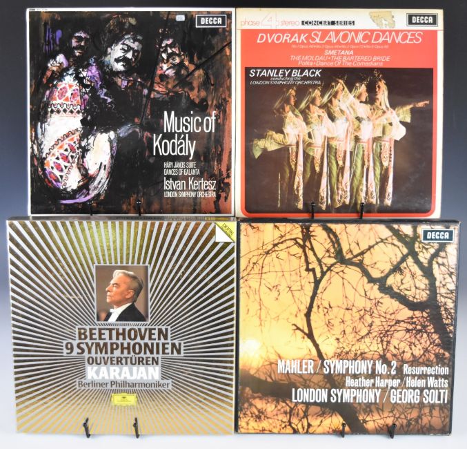 Collection of approximately thirty seven Classical LPs and six Classical box sets, includes Columbia SAX and Decca SXL rarities / collectibles including Karajan Sibelius Symphony No 2 (Columbia SAX 2379) with pale blue Colombia label, Tchaikovsky Symphony No5 (Columbia SAX 2497) and two additional SAX series LPs, Romantic Russia Georg Solti (Decca SXL 6363) with black label, Bartok (Decca SXL 6212) with black label, Music of Kodaly (Decca SXL 6136) with black label, Mahler Symphony No 2 (Decca 325-6) stereo box set, Beethoven (Deutsche Grammophon 415 066-1) LP box set, fourteen additional Decca LPs of which four are SXL series, etc