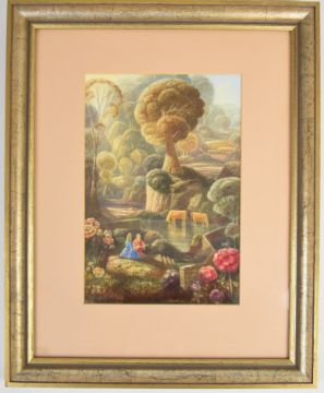 Leonard Hitchcock (1914-2009) watercolour surreal landscape with minstrel serenading a maiden within a forest glade, besides a stream where cattle are drinking, signed Leonard Hitchcock bottom left, 25 x 17cm framed