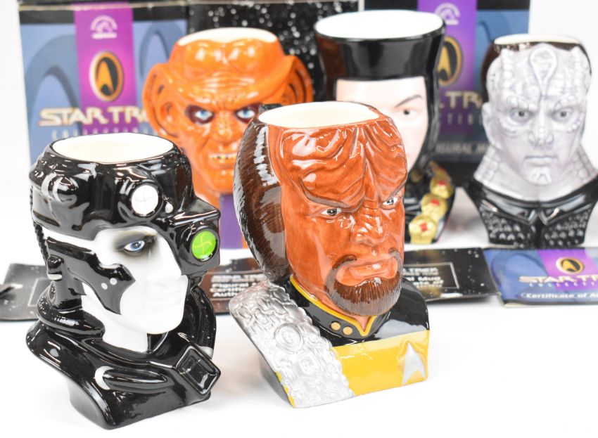 Six Star Trek: The Next Generation and Deep Space Nine figural mugs by Applause comprising Borg, Quark, Lieutenant Worf, Kazon, Q and Cardassian, in original boxes with certificates.