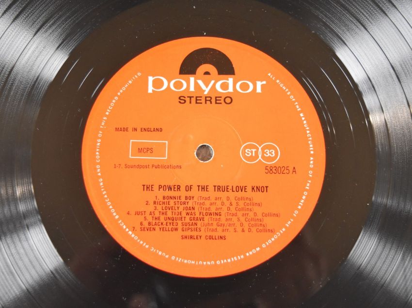 Shirley Collins The Power Of The True Love Knot (Polydor 583025) stamped matrix 583205 A//1 420 and B//1 420 and Love, Death And The Lady (Harvest SHVL 771) stamped matrix SHVL 771 A-1 and 771 B-1, both are UK first pressing. Records appear VG / VG+