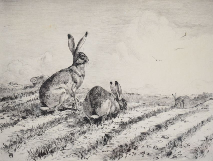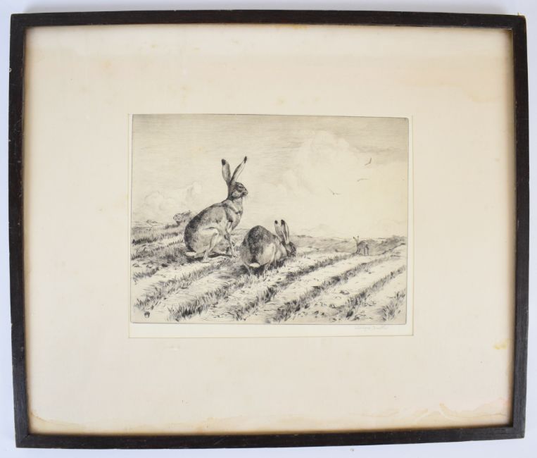 Winifred Austen RE 'Hares In The Young Wheat', original etching signed in pencil by the artist lower margin, 19 x 25cm, mounted and framed with Arthur Greatorex Ltd gallery labelon reverse
