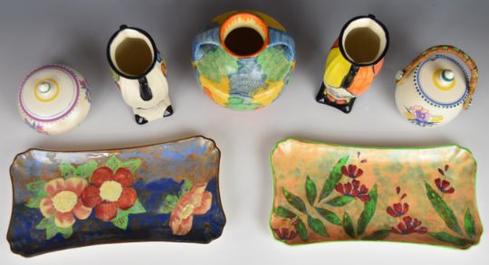 Collection of collectible ceramics including Royal Crown Derby Imari vase, Moorcroft pin dishes / vase, Art Deco Wadeheath vase, Poole pottery, Royal Doulton faience art pottery vase, further Royal Doulton, Derby paperweight, Copenhagen vases and bird figure, Crown Devon vases, etc, tallest 16cm