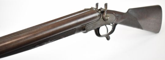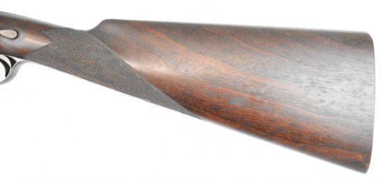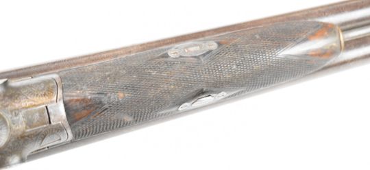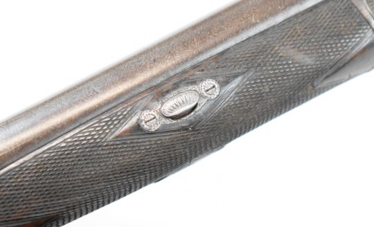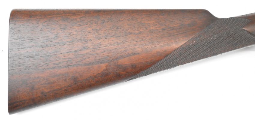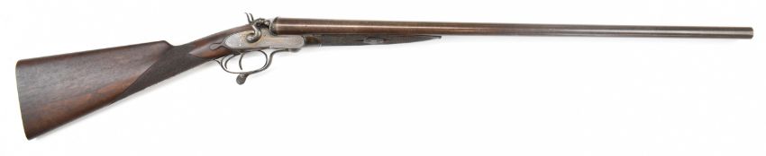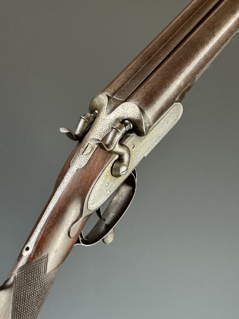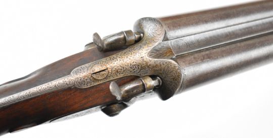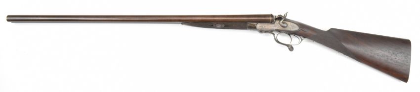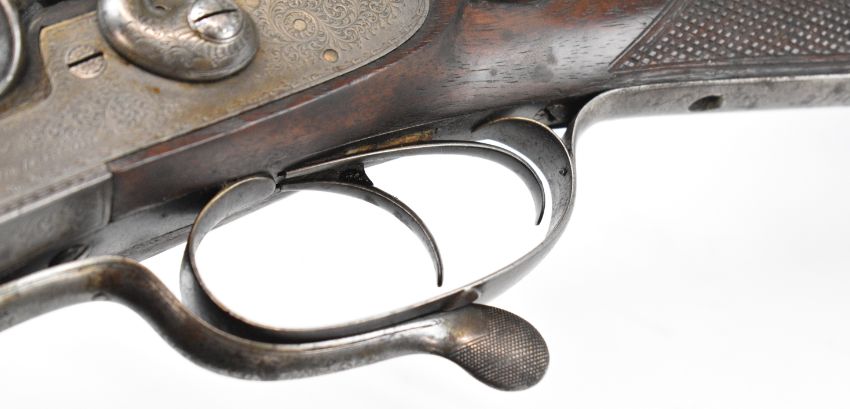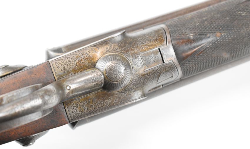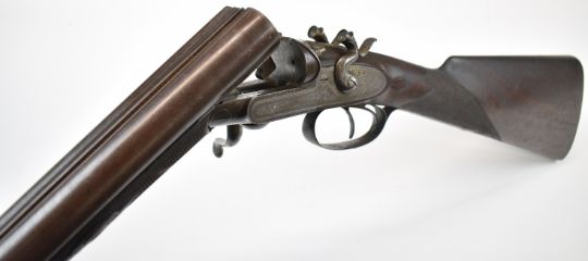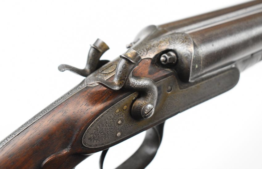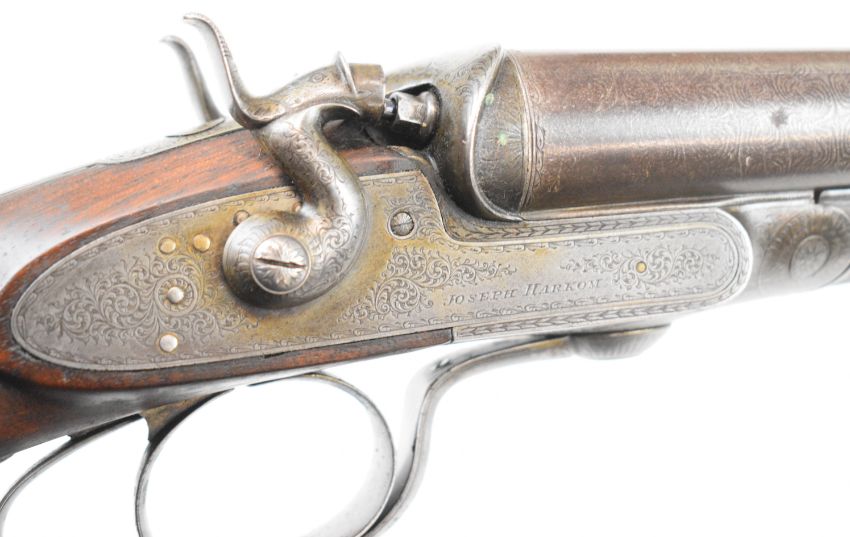 Joseph Harkom of Edinburgh 12 bore side by side hammer action shotgun with named and engraved locks, engraved hammers, trigger guard, rotary underlever, underside, top plate and fences, chequered grip and forend, carved teardrop to the wrist, double trigger and named 29 inch Damascus barrels choked cylinder, overall length 114.5cm, length of pull 35cm, serial number 1040PLEASE NOTE THAT A VALID RELEVANT SHOTGUN CERTIFICATE IS REQUIRED TO VIEW OR PURCHASE THIS LOT AND FOR ALL SHOTGUNS OR RIFLES PLEASE ENSURE YOU HAVE THE RELEVANT CERTIFICATE BEFORE BIDDING.