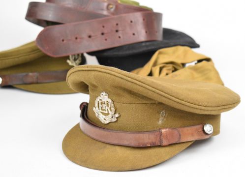 Collection of military hats, belts and webbing and badges, most Royal Military Police including silver badges