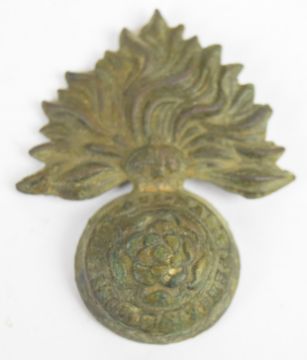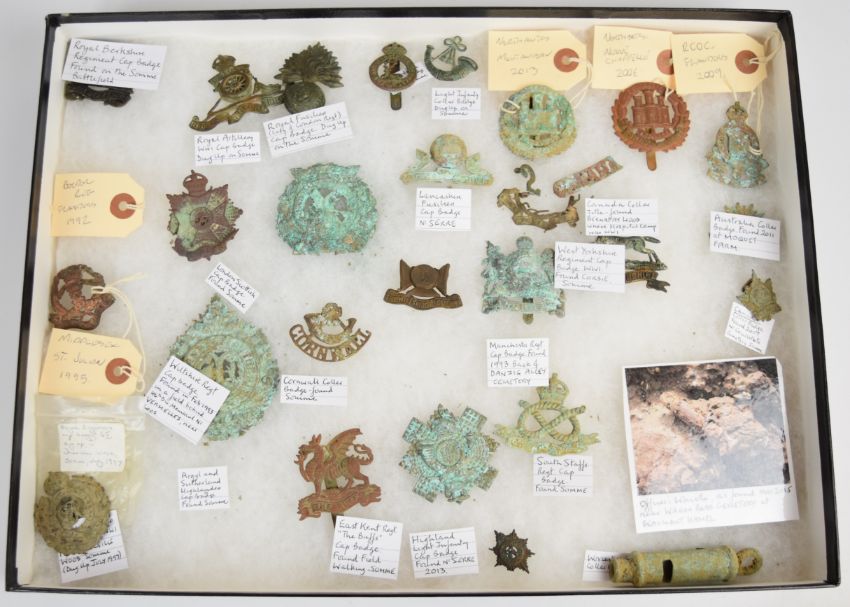 Framed display of WW1 battlefield find badges, most annotated including Somme, Neuve Chapelle and Loos, badges include West Yorkshire, ROC, Northamptonshire, Manchester, South Staffordshire, Highland Light Infantry, Worcester, Canada, Wiltshire and Berkshire, overall width of display 41.5cm