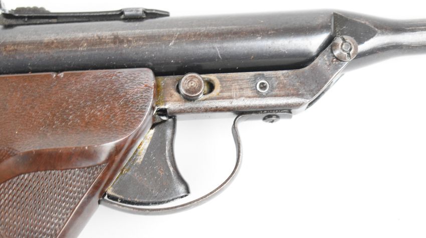 Hy-Score .22 target air pistol with engraved frame, named, shaped and chequered Bakelite grips and adjustable sights, serial number 923898. PLEASE NOTE IF YOU REQUIRE POSTAGE ALL POST 1939 AIR GUNS CAN ONLY BE SENT TO AN RFD.