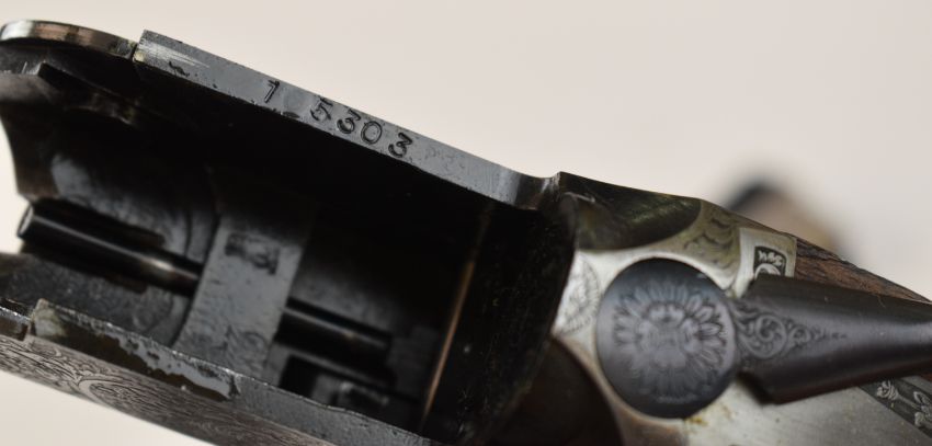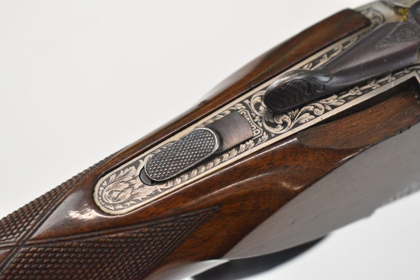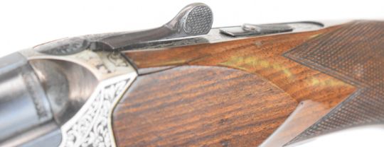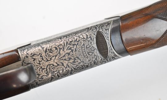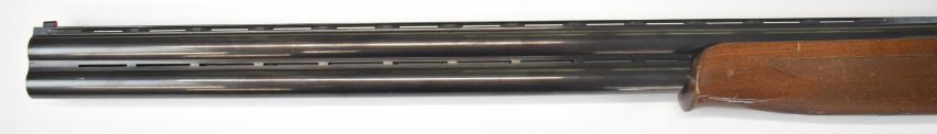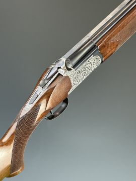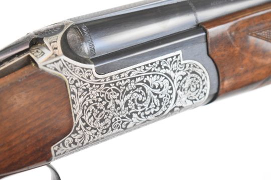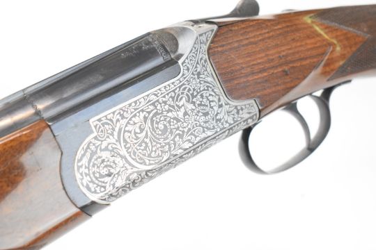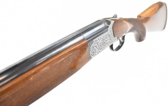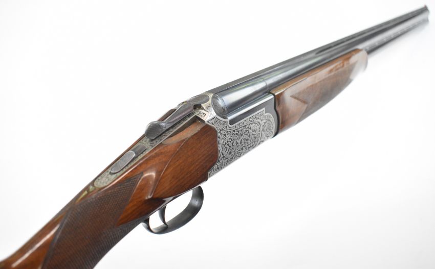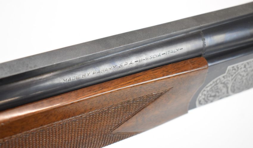 Fabarm 12 bore over and under ejector shotgun with engraved locks, underside, top plate and thumb lever, chequered semi-pistol grip and forend, single trigger, vented top and central ribs and 29 inch barrels choked ½ and cylinder, overall length 116cm, length of pull 35.5cm, serial number 105303. PLEASE NOTE THAT A VALID RELEVANT SHOTGUN CERTIFICATE IS REQUIRED TO VIEW OR PURCHASE THIS LOT AND FOR ALL SHOTGUNS OR RIFLES PLEASE ENSURE YOU HAVE THE RELEVANT CERTIFICATE BEFORE BIDDING.