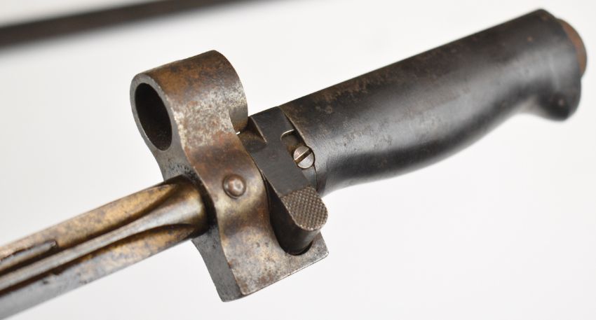 French 1886 pattern Lebel bayonet with blackened steel handle, cruciform blade and steel scabbard numbered F70910, overall length 65cm. PLEASE NOTE: WE ARE NOT ABLE TO OFFER OUR USUAL POSTAGE SERVICE FOR THIS LOT