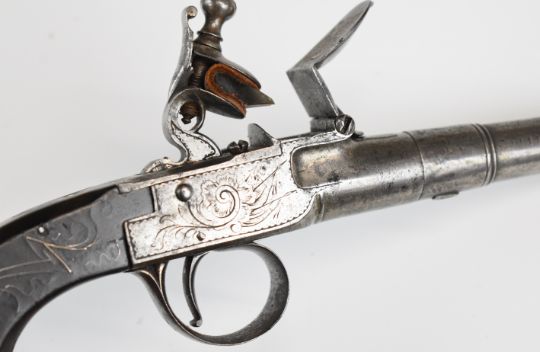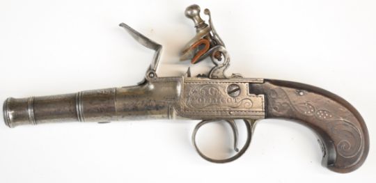 G Collicot of Bristol flintlock pocket pistol with named and engraved locks, engraved trigger guard and top strap, silver wire inlaid wooden grips and 3.5 inch turn-off smooth-bored barrel, overall length 19.5cm.
