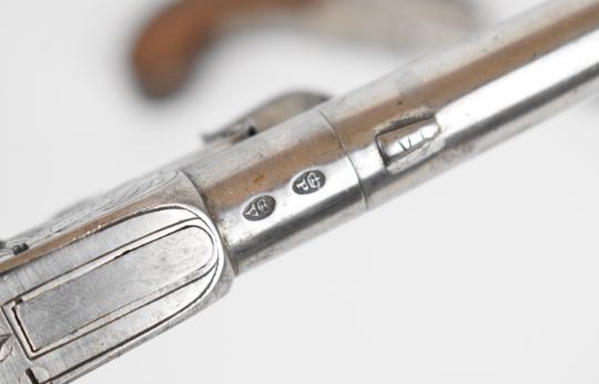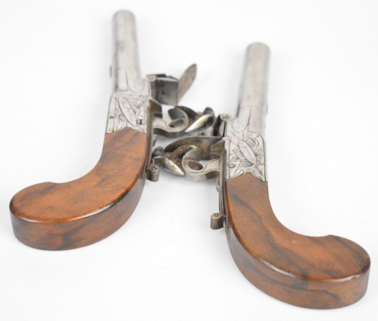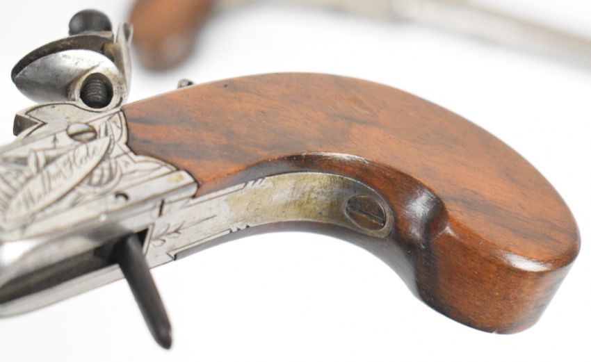 A pair of William Hole of Bristol flintlock pocket pistols each with named and engraved lock, line engraved hammer and underside, thumb slide safety, folding trigger, shaped wooden grip and 3 inch smooth bored turn-off barrel, overall length 18cm.