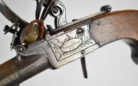 Vaughan of Bristol flintlock pocket pistol with named and engraved lock, line engraved hammer and underside, thumb slide safety, folding trigger, shaped wooden grip and 2.5 inch smooth bored turn-off barrel, overall length 18cm.