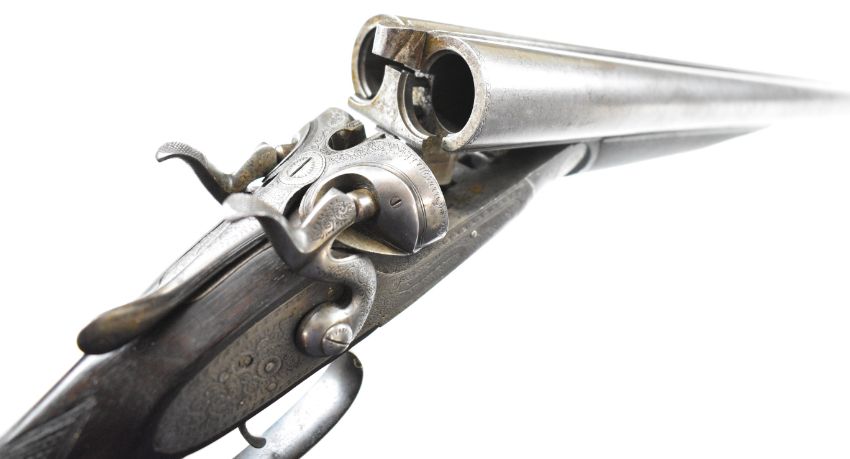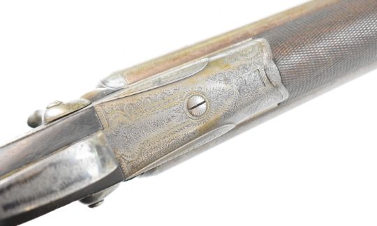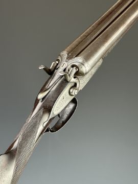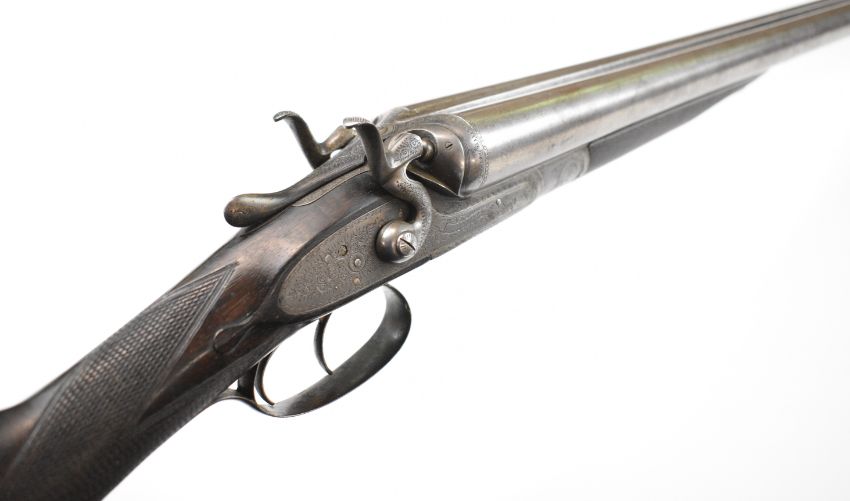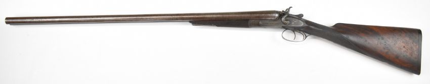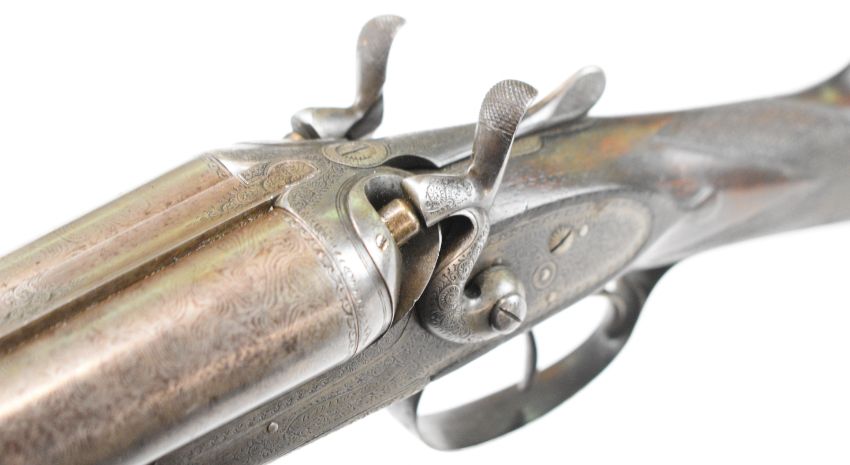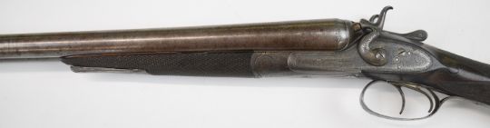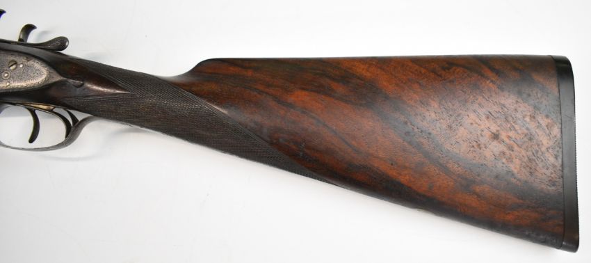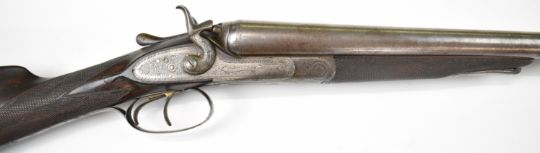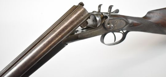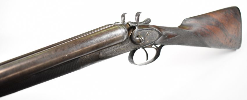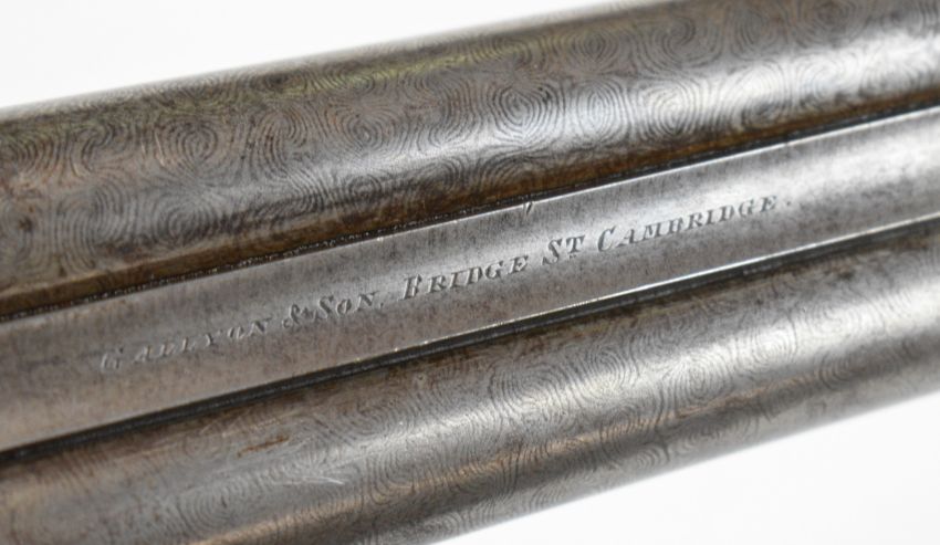 Gallyon & Son of Cambridge 12 bore side by side hammer action shotgun with named and engraved locks, engraved hammers, trigger guard, underside, top plate, thumb lever and fences, chequered grip and forend, carved teardrop to the wrist, vacant cartouche to the underside of the stock, double trigger and named 29.75 inch Damascus barrels choked ½ and improved cylinder, overall length 118.5cm, length of pull 37cm, serial number 5003PLEASE NOTE THAT A VALID RELEVANT SHOTGUN CERTIFICATE IS REQUIRED TO VIEW OR PURCHASE THIS LOT AND FOR ALL SHOTGUNS OR RIFLES PLEASE ENSURE YOU HAVE THE RELEVANT CERTIFICATE BEFORE BIDDING.