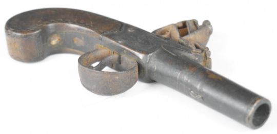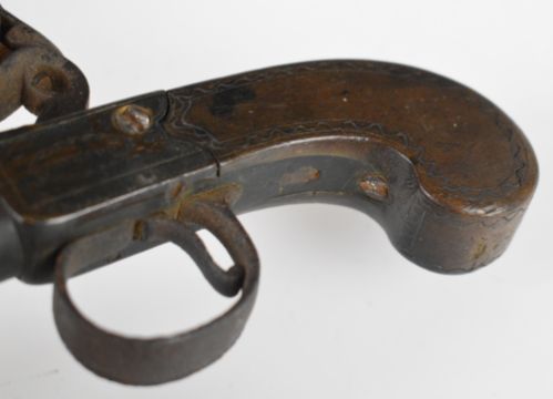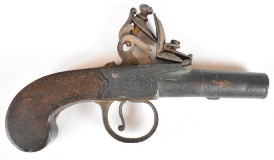Jackson of London flintlock pocket pistol with named and engraved locks, shaped wooden grips and 2.5 inch turn-off smooth-bored barrel, overall length 15.8cm.