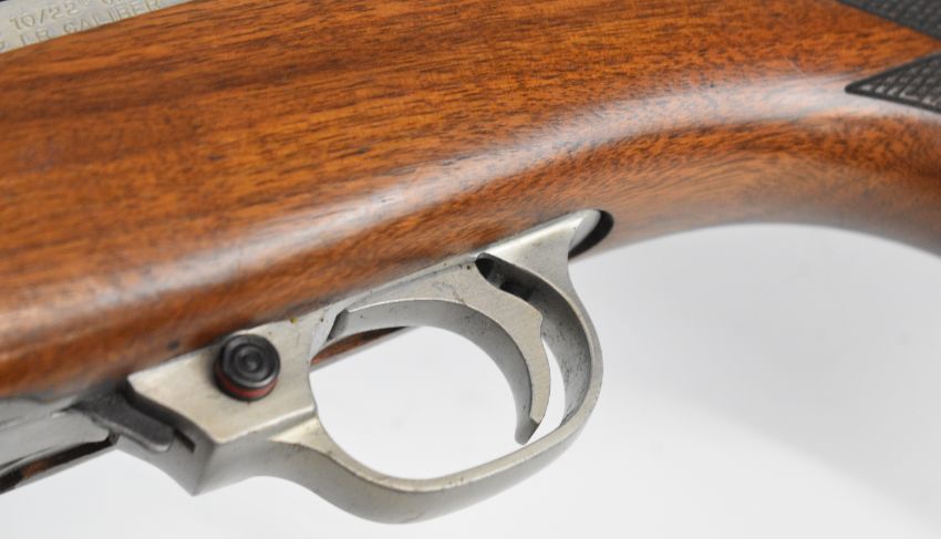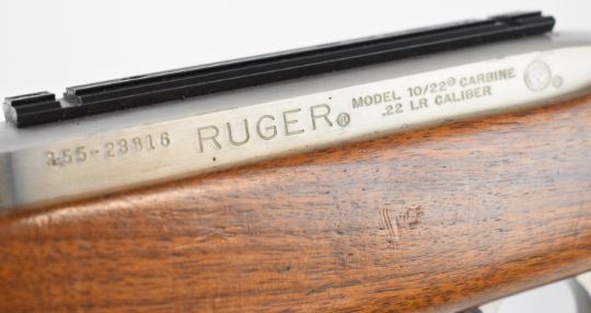 Ruger Model 10/22 .22 semi-automatic rifle with chequered semi-pistol grip and forend, multi-shot magazine, bi-pod, scope rail, sound moderator and 26 inch barrel, overall length 113cm, serial number 255-23816. PLEASE NOTE THAT A VALID RELEVANT FIREARMS CERTIFICATE IS REQUIRED TO VIEW OR PURCHASE THIS LOT AND FOR ALL SHOTGUNS OR RIFLES PLEASE ENSURE YOU HAVE THE RELEVANT CERTIFICATE BEFORE BIDDING.
