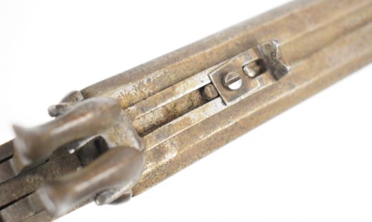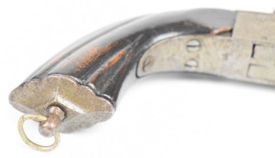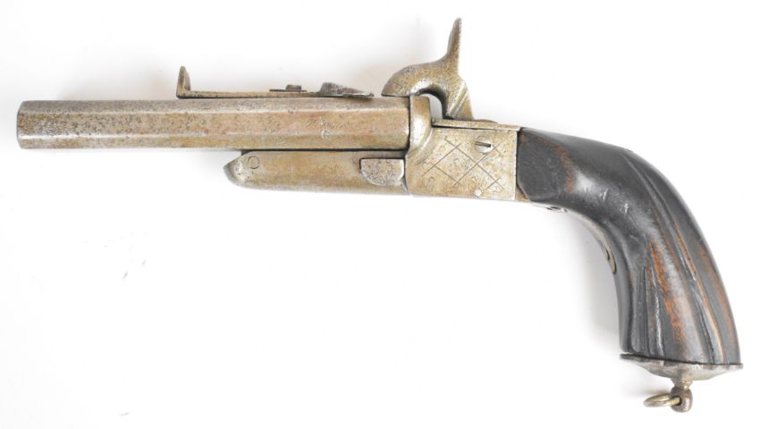 Unnamed double barrelled side by side percussion hammer action pistol with chequered lock plates, reeded grip, belt loop, folding triggers and 4.5 inch smooth bored octagonal barrels, overall length 23cm.