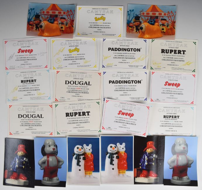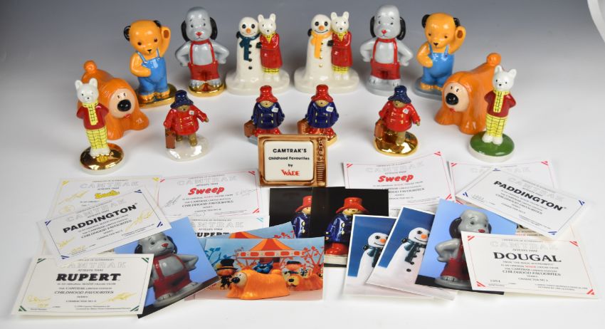 Two sets of seven Wade 'Childhood Favourites', figures made for Camtrak comprising Paddington Bear, Magic Roundabout Dougal, Rupert Bear, Sooty and Sweep, four having gold bases, some with certificates, together with a 'Wade Camtrak' point of sale advertising sign.