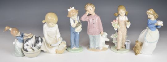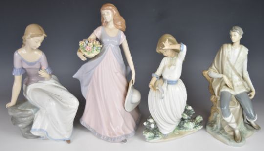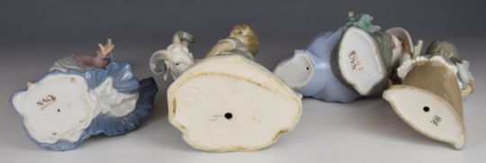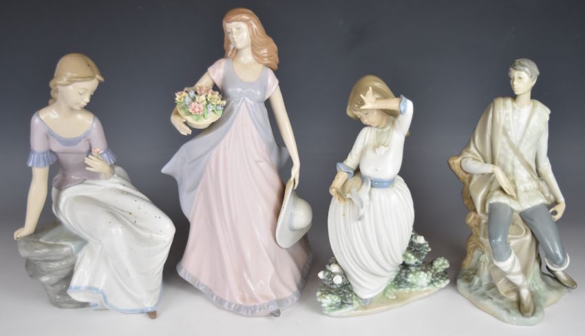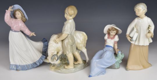 Fourteen Lladro / Nao figurines including figures with dogs, goat etc, tallest 28cm