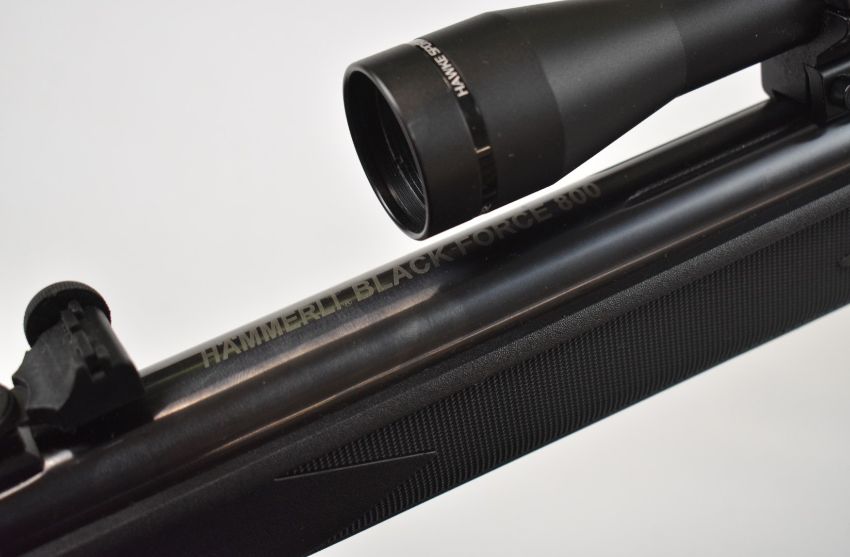 Hammerli Black Force 800 .22 air rifle with composite semi-pistol grip and forend, composite stock, adjustable sights and Hawke Sport HD 4x32 scope, serial number 017970. PLEASE NOTE IF YOU REQUIRE POSTAGE ALL POST 1939 AIR GUNS CAN ONLY BE SENT TO AN RFD.
