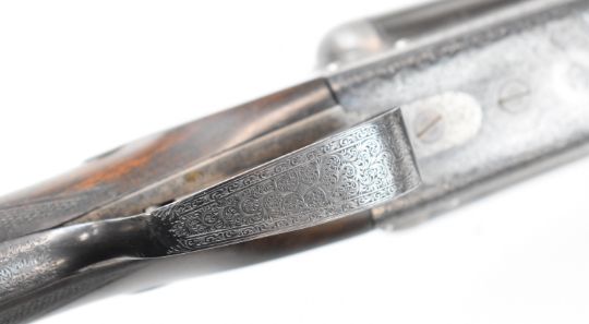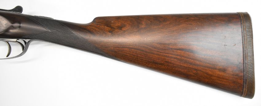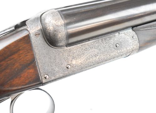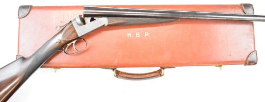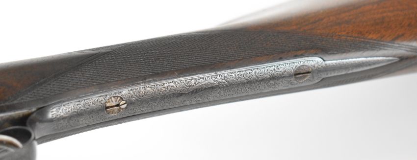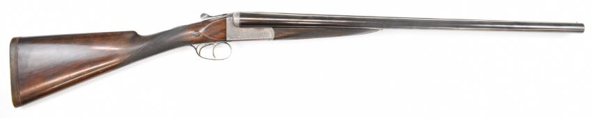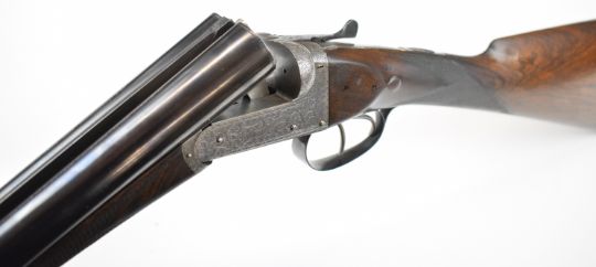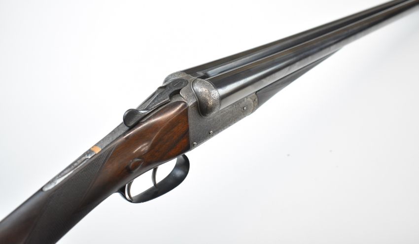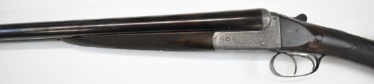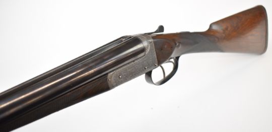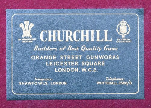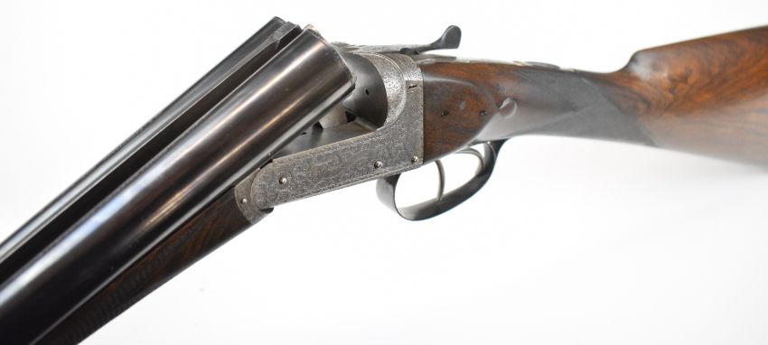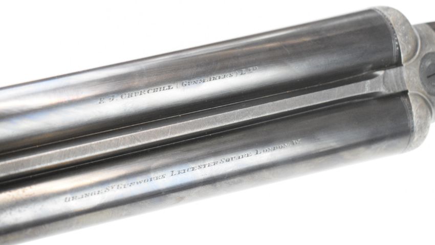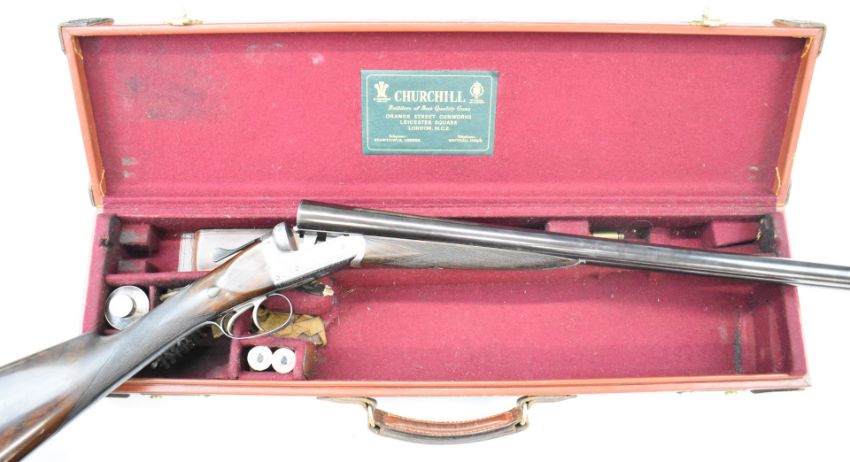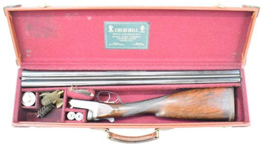 E J Churchill 12 bore side by side ejector shotgun with named and engraved locks, engraved underside, trigger guard, top plate, thumb lever and fences, chequered grip and forend, carved teardrop to the wrist, double trigger and named 25 inch barrels choked cylinder, overall length 105.5cm, length of pull 37cm, serial number 1019, in fitted leather case with accessories and 'Churchill Builders of Best Quality Guns Orage Street Gunworks Leicester Square W.C.2.' label. PLEASE NOTE THAT A VALID RELEVANT SHOTGUN CERTIFICATE IS REQUIRED TO VIEW OR PURCHASE THIS LOT AND FOR ALL SHOTGUNS OR RIFLES PLEASE ENSURE YOU HAVE THE RELEVANT CERTIFICATE BEFORE BIDDING.