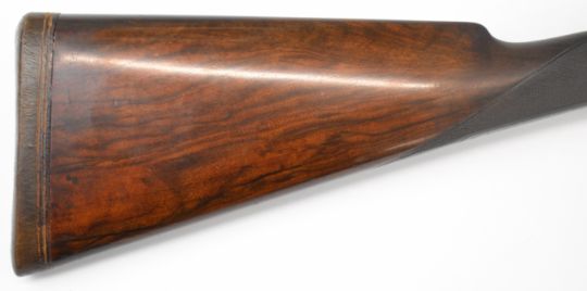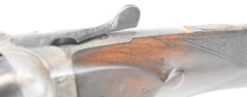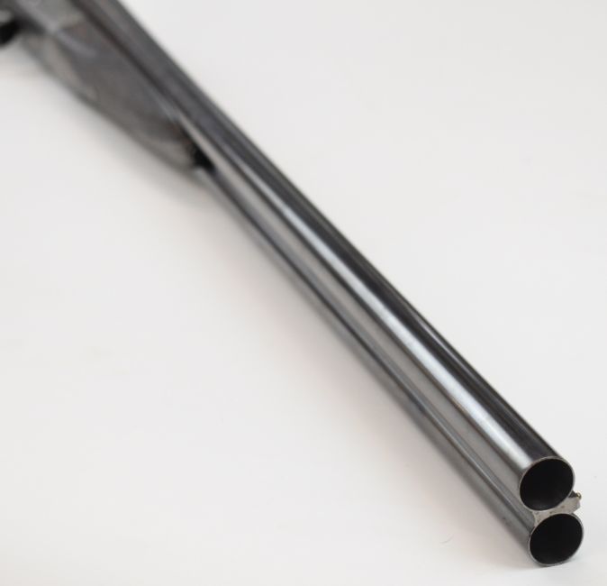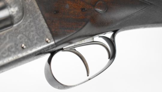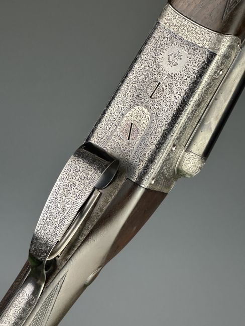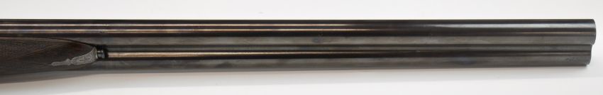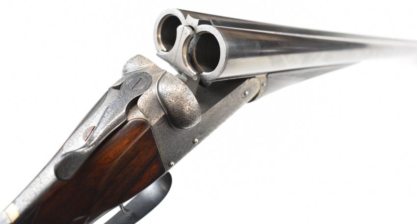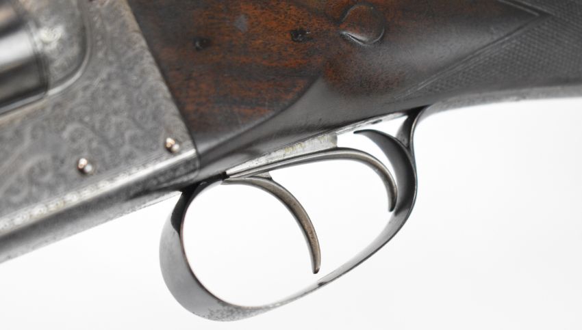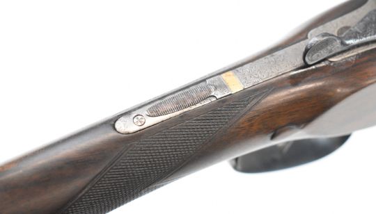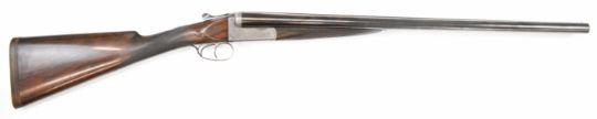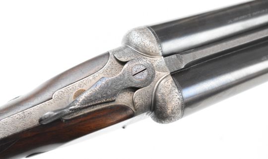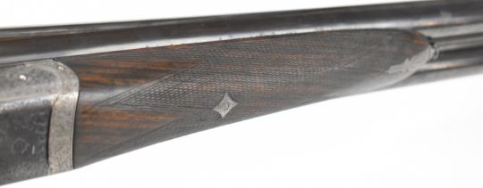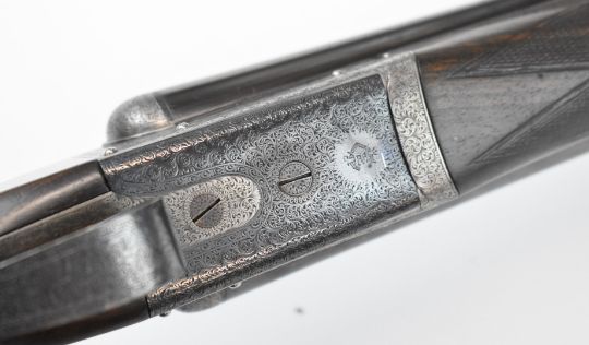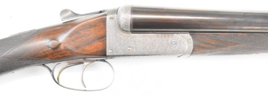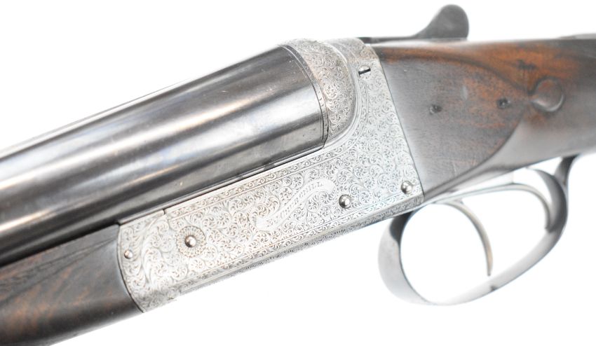 E J Churchill 12 bore side by side ejector shotgun with named and engraved locks, engraved underside, trigger guard, top plate, thumb lever and fences, chequered grip and forend, carved teardrop to the wrist, double trigger and named 25 inch barrels choked cylinder, overall length 105.5cm, length of pull 37cm, serial number 1019, in fitted leather case with accessories and 'Churchill Builders of Best Quality Guns Orage Street Gunworks Leicester Square W.C.2.' label. PLEASE NOTE THAT A VALID RELEVANT SHOTGUN CERTIFICATE IS REQUIRED TO VIEW OR PURCHASE THIS LOT AND FOR ALL SHOTGUNS OR RIFLES PLEASE ENSURE YOU HAVE THE RELEVANT CERTIFICATE BEFORE BIDDING.