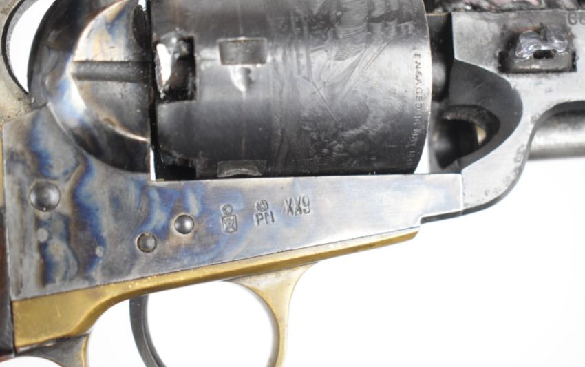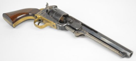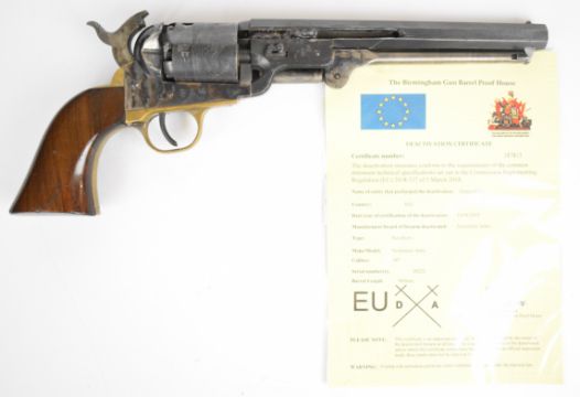 Deactivated Westerner's Arms .36 six shot single action percussion revolver with engraved scenes of ships to the cylinder, wooden grips, brass trigger guard and grip strap and 7.5 inch octagonal barrel, overall length 35cm, serial number 38222, with de-activation certificate dated 14/04/25.