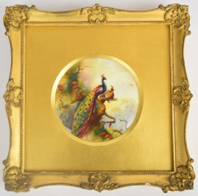 J Bray for Royal Worcester circular porcelain plaque decorated with a pair of peacocks in a pine tree, signed lower right and with puce mark verso, diameter 11cm