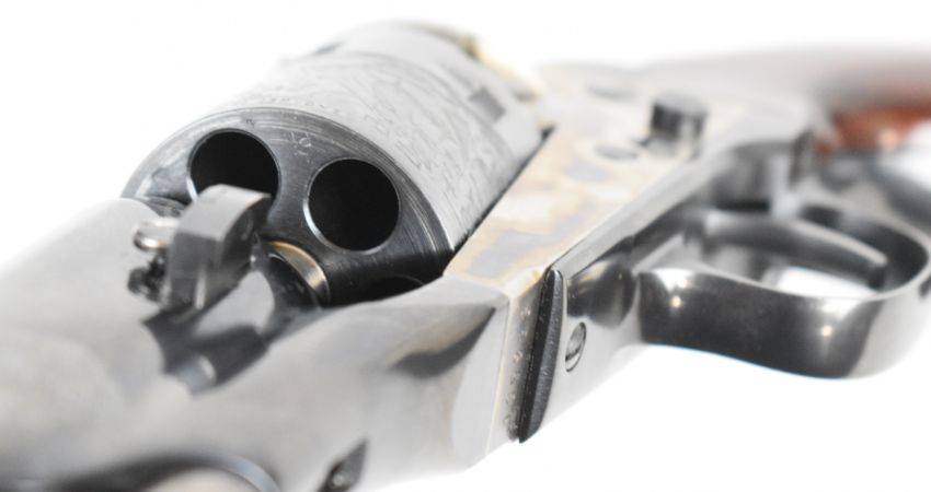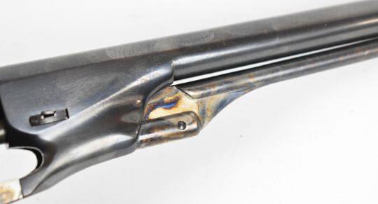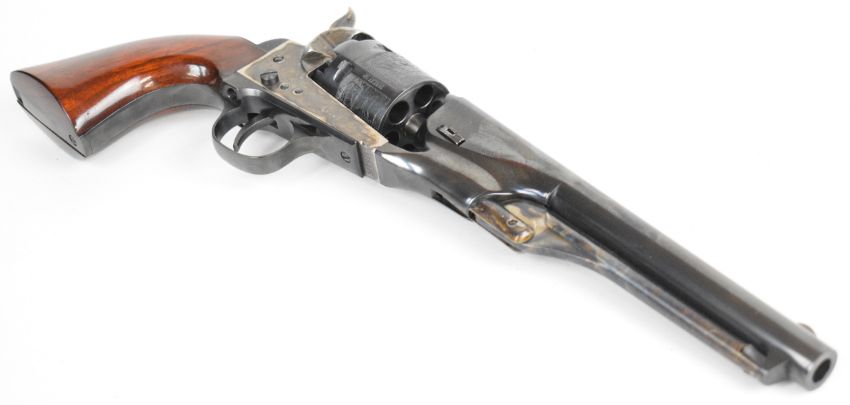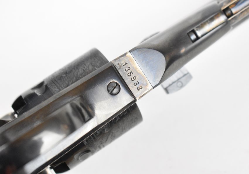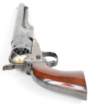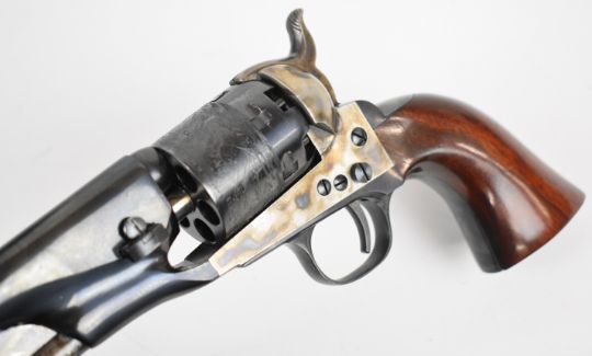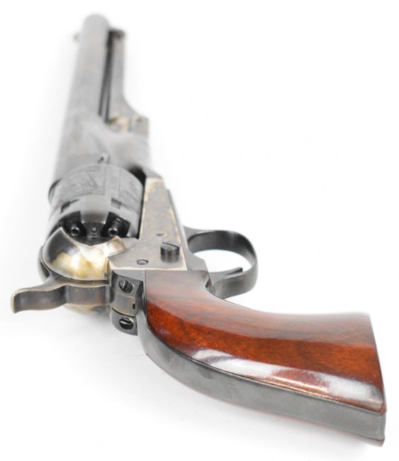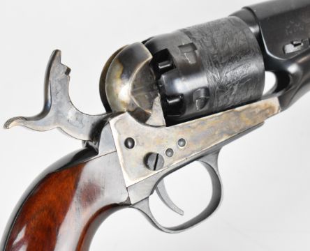 Uberti .36 six-shot single-action percussion revolver with engraved scenes of ships to the cylinder, wooden grips and 7.5 inch barrel, overall length 35cm, serial number 135933. PLEASE NOTE THAT A VALID RELEVANT FIREARMS CERTIFICATE IS REQUIRED TO VIEW OR PURCHASE THIS LOT AND FOR ALL SHOTGUNS OR RIFLES PLEASE ENSURE YOU HAVE THE RELEVANT CERTIFICATE BEFORE BIDDING.