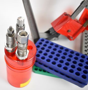 A collection of .303, .357, .38, .450-400, 9mm Luger, 8mm Mauser, 6mm Creedmore and .458 Win Mag rifle cartridge re-loading equipment including Lee press, brass cases, dies, bullets etc.