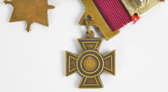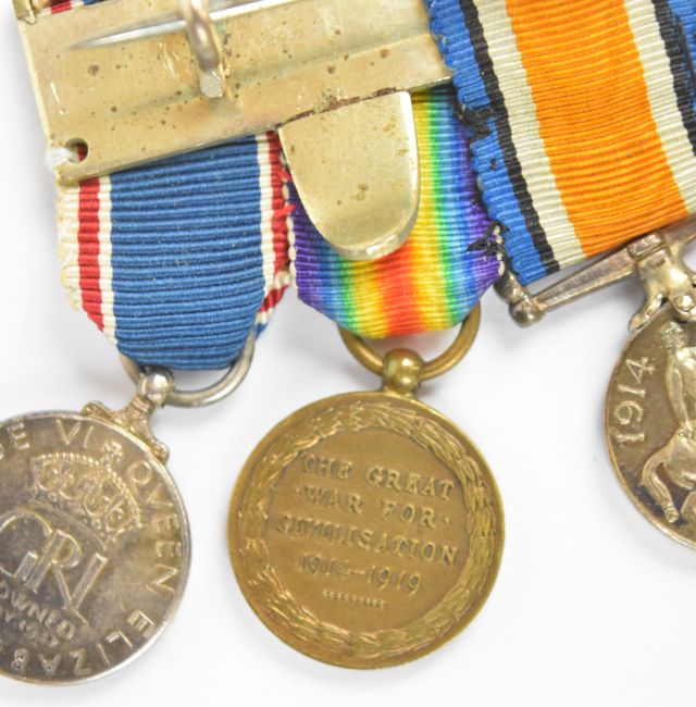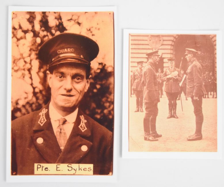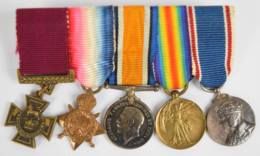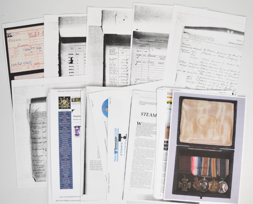 Pte Ernest Sykes miniature Victoria Cross medal group comprising Victoria Cross, 1914-15 Star, 1914-18 Medal, Great War Medal and George VI Coronation Medal in A.H. Baldwin & Sons box, together with a 1929 V.C. Dinner booklet including Sykes in the list of attendees. The Gazette entry for Sykes' award of the V.C. was: No. 40989 Pte. Ernest Sykes, Northumberland Fusiliers. For most conspicuous bravery and devotion to duty when his battalion in attack was held up about 350 yards in advance of our lines by intense fire from front and flank, and suffered heavy casualties. Pte. Sykes, despite this heavy fire, went forward and brought back four wounded—he made a fifth journey and remained out under conditions which appeared to be certain death, until he had bandaged all those who were too badly wounded to be moved. These gallant actions, performed under incessant machine gun and rifle fire, showed an utter contempt of danger'. Sykes was a guard on the railways and had a Claughton and later LMS locomotive named after him, also included is a large quantity of printed research including photographs of him on the footplate of one of these locomotives. Provenance: Ex-David Harvey Collection, author of Monuments to Courage, the full sized medals are housed in the museum at Alnwick Castle