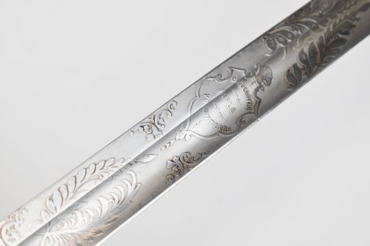 Gloucester Rifle Volunteers Thomas Fletcher Gloucester Victorian dress sword with wire bound shagreen grip and Queen's crown to guard, the fullered blade having maker's name and etched for the Gloucester Rifle Volunteers, in steel scabbard, overall length 99cm.PLEASE NOTE: WE ARE NOT ABLE TO OFFER OUR USUAL POSTAGE SERVICE FOR THIS LOT