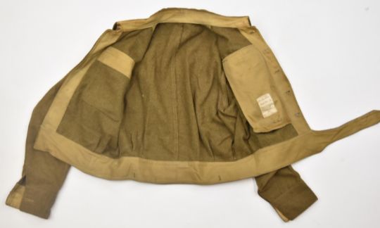 Major Richardson Royal Artillery WW2 battledress jacket with applied mentioned in dispatches oak leaf, dated to the label 1944 and marked CWS, size No 12, given to the vendor by Major Richardson himself