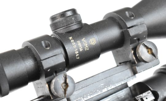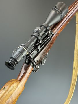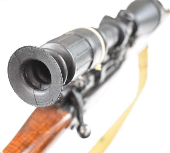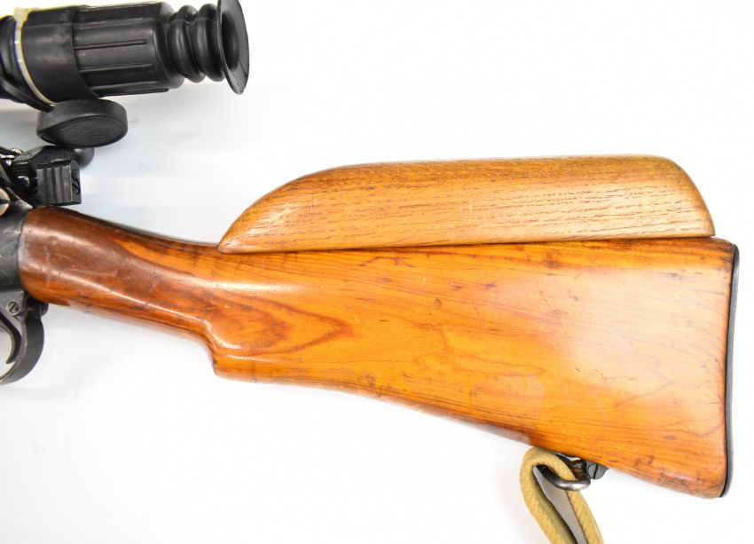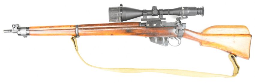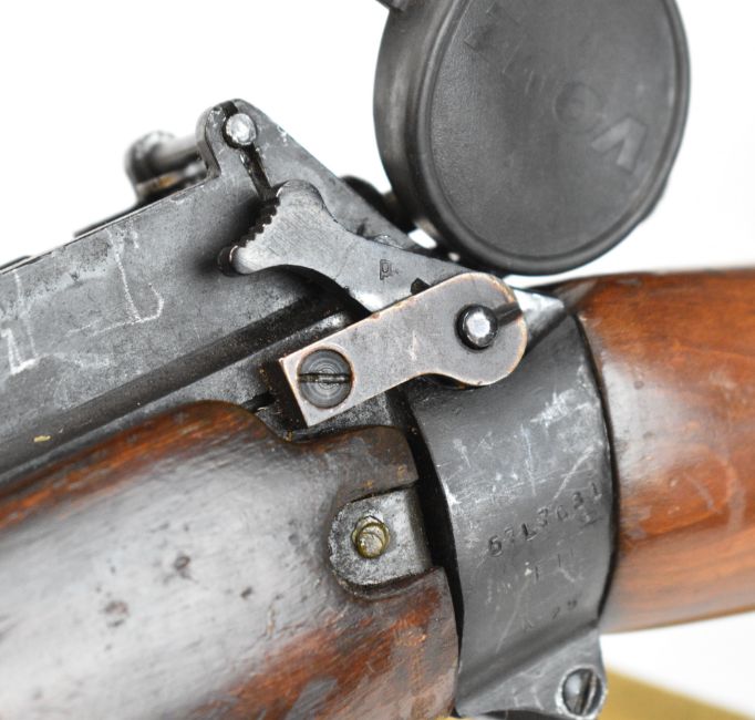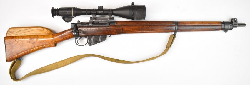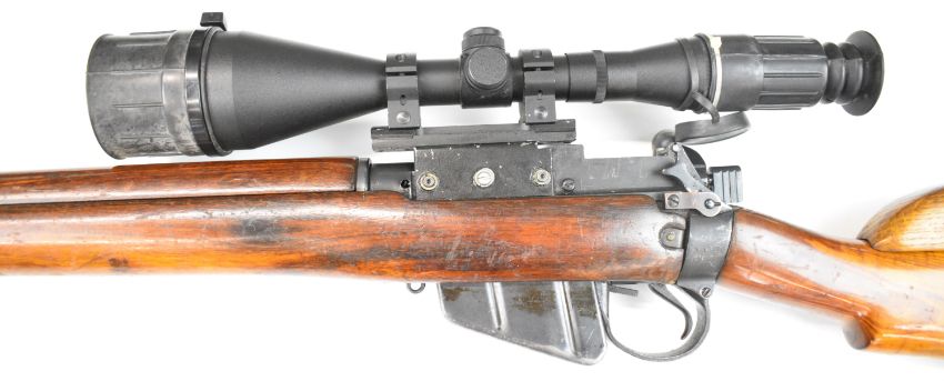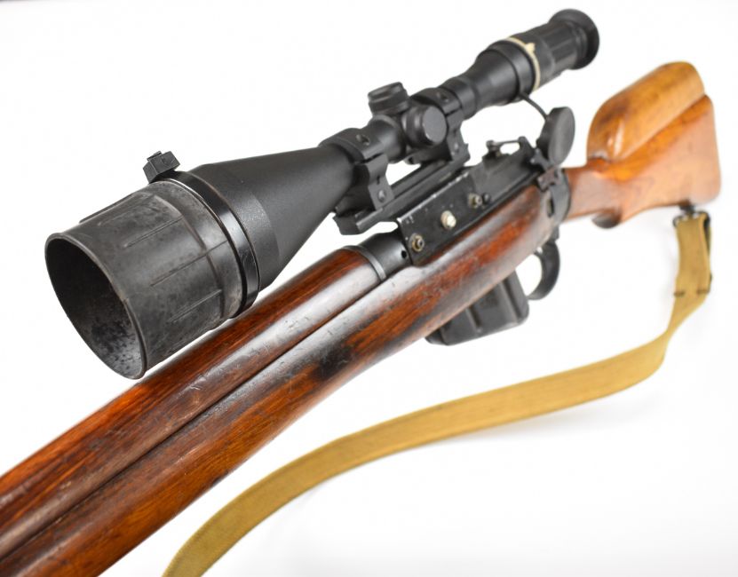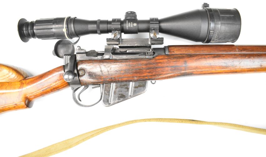 Lee-Enfield .303 bolt-action rifle with raised comb, canvas sling, multi-shot magazine, Vomz 8x56 scope and 25 inch barrel, overall length 112cm, serial number 57L7031. PLEASE NOTE THAT A VALID RELEVANT FIREARMS CERTIFICATE IS REQUIRED TO VIEW OR PURCHASE THIS LOT AND FOR ALL SHOTGUNS OR RIFLES PLEASE ENSURE YOU HAVE THE RELEVANT CERTIFICATE BEFORE BIDDING.
