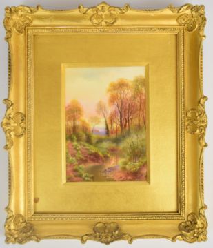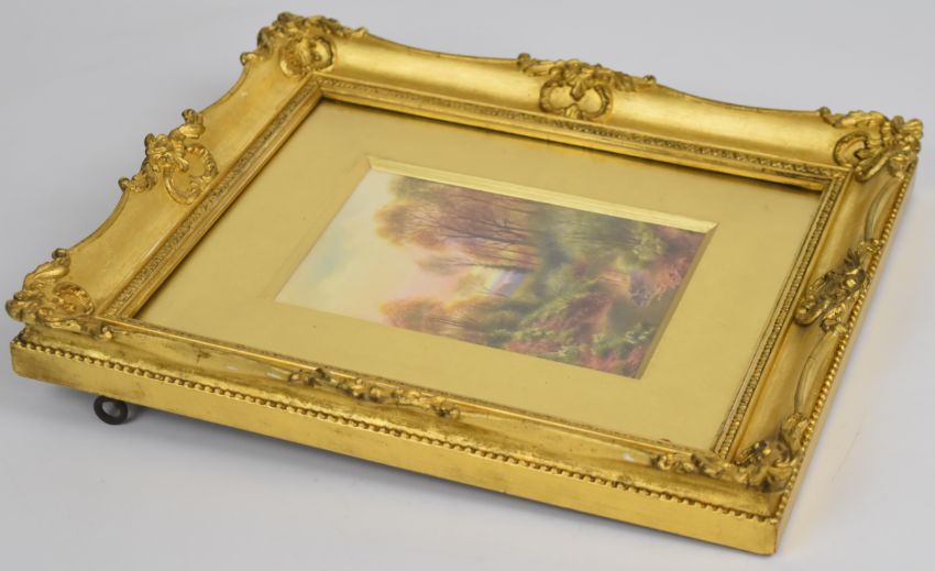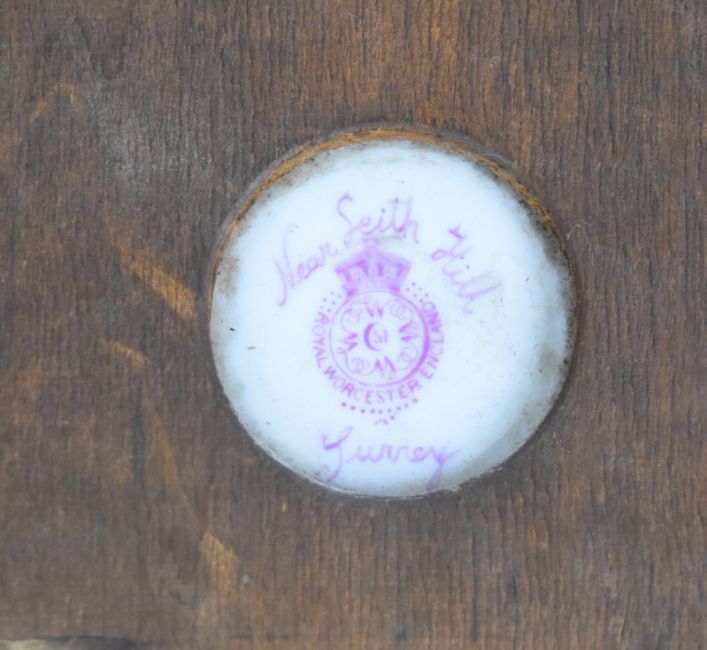 Raymond Rushton (1925-2006) for Royal Worcester porcelain plaque hand decorated with a meandering river in wooded landscape, entitled verso 'Near Seith Hill, Surrey' next to puce Royal Worcester mark, 15 x 10cm