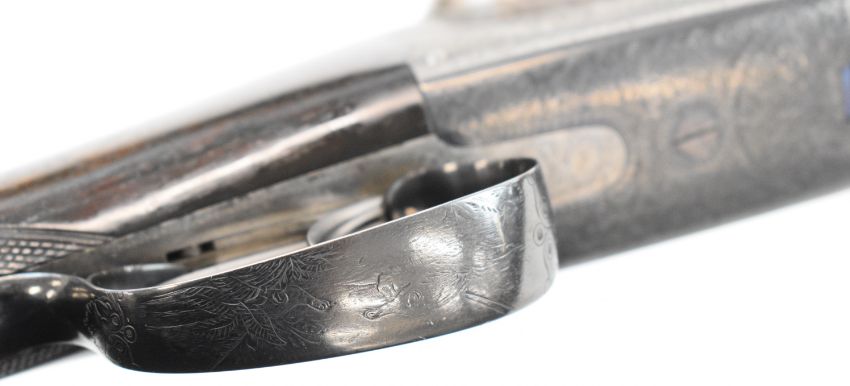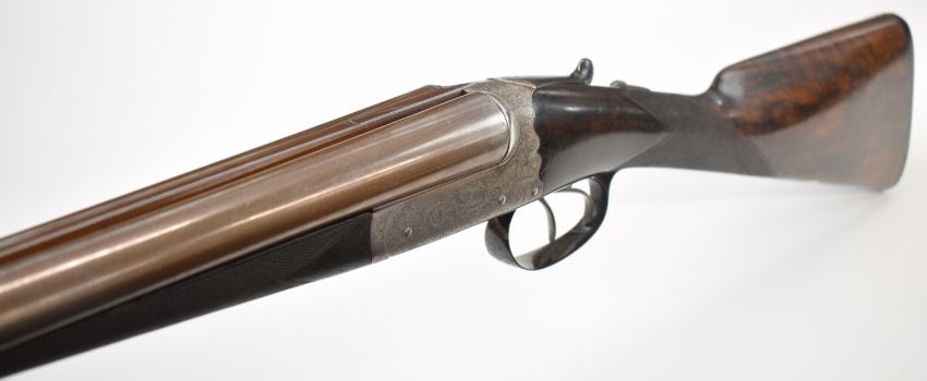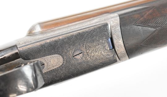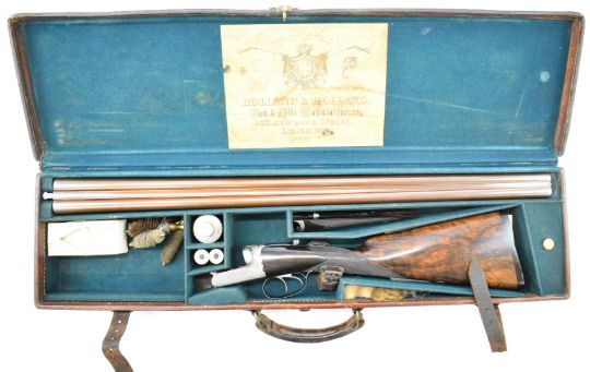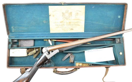 Westley Richards 12 bore side by side ejector shotgun with named and engraved locks, engraved underside, trigger guard, top plate, thumb lever and fences, chequered grip and horn tipped forend, engraved cartouche to the underside of the stock, double trigger and named 30 inch Damascus barrels choked ½ and cylinder and engraved 'Westley Richards 170 New Bond St London', overall length 116.5cm, length of pull 35.5cm, serial number 15266, in Holland & Holland fitted leather bound case with oil bottle, snapcaps, accessories and 'Holland & Holland Gun & Rifle Manufacturers 28 New Bond Street London Established 1835' label. PLEASE NOTE THAT A VALID RELEVANT SHOTGUN CERTIFICATE IS REQUIRED TO VIEW OR PURCHASE THIS LOT AND FOR ALL SHOTGUNS OR RIFLES PLEASE ENSURE YOU HAVE THE RELEVANT CERTIFICATE BEFORE BIDDING.