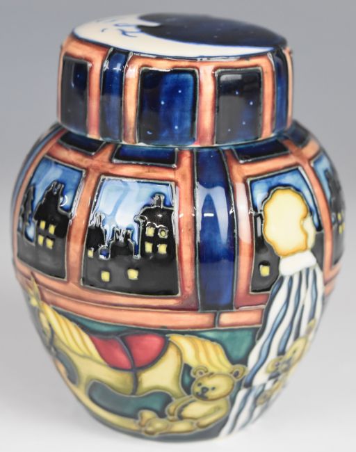 Moorcroft trial covered ginger jar decorated with a child in a nursery with Teddy bear, rocking horse and beach ball, looking out on a cityscape at night and with man in the moon to cover, dated 2000, H11cm