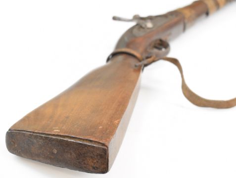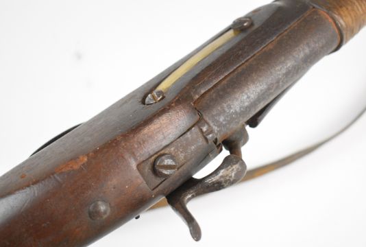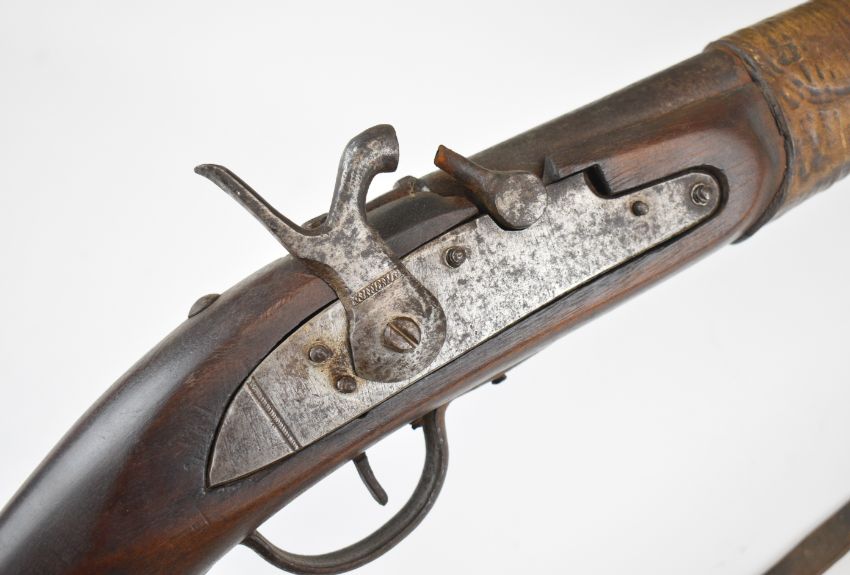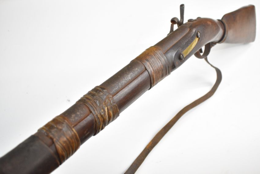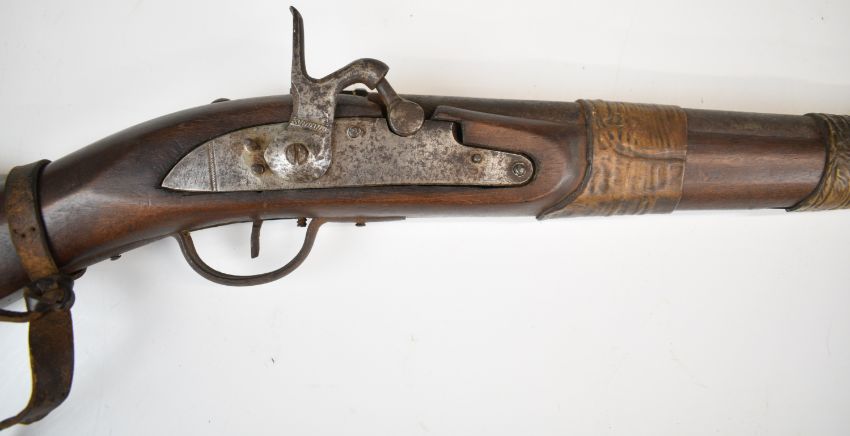Indian 8 bore percussion converted form flintlock gun with leather barrel bands, steel ram-rod, leather sling and 44 inch gold inlaid barrel, overall length 154cm.