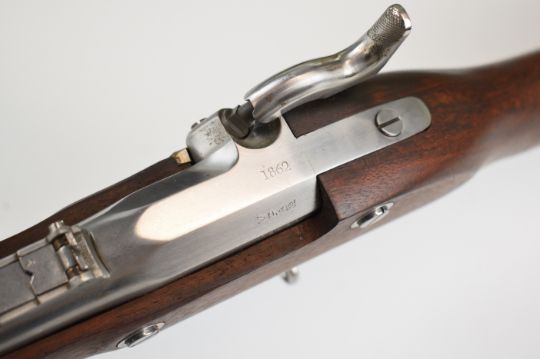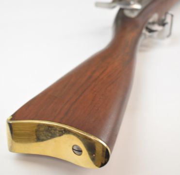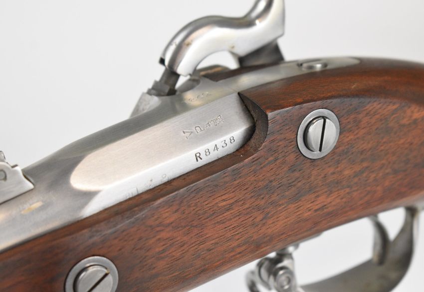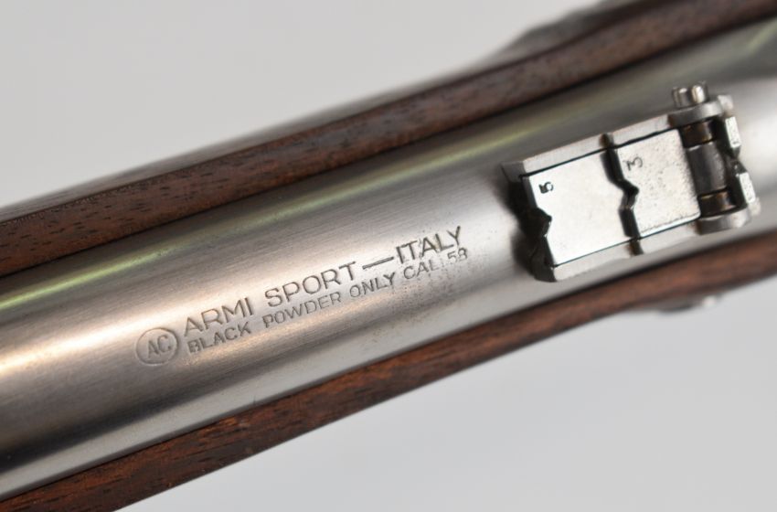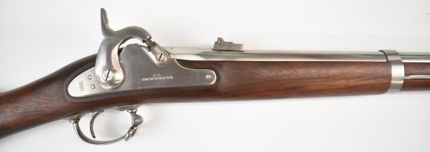 Armi Sport C G Richmond 1862 .58 muzzle loading percussion hammer action three band rifle with named lock, brass butt plate, steel trigger guard, mounts and ramrod, sling suspension mounts, pop-up leaf sights and 40 inch rifled barrel, overall length 140cm, serial number R8438. PLEASE NOTE THAT A VALID RELEVANT FIREARMS CERTIFICATE IS REQUIRED TO VIEW OR PURCHASE THIS LOT AND FOR ALL SHOTGUNS OR RIFLES PLEASE ENSURE YOU HAVE THE RELEVANT CERTIFICATE BEFORE BIDDING.