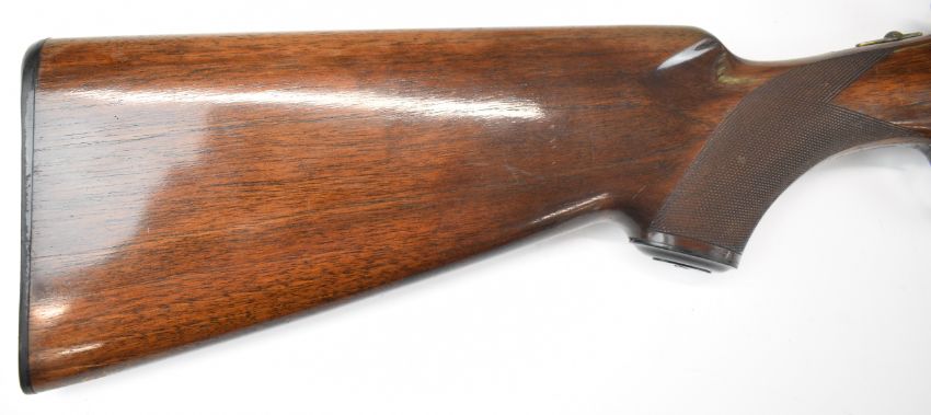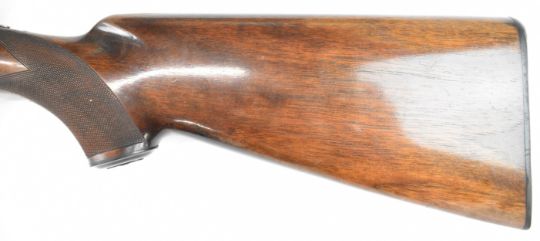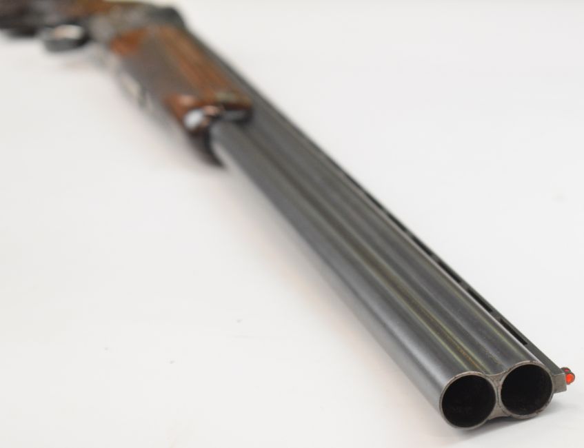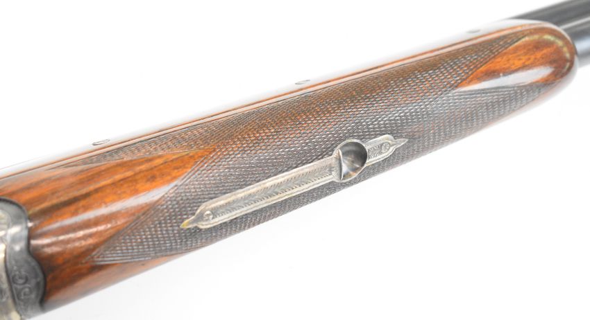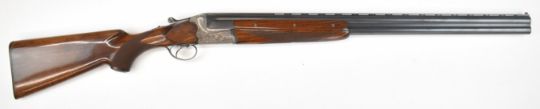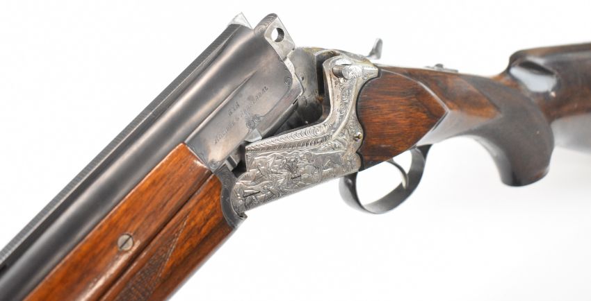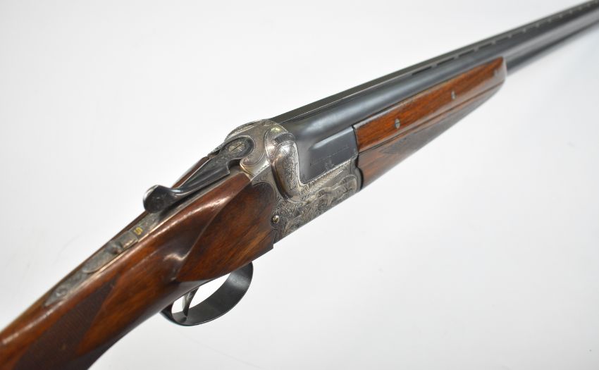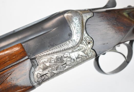 AYA Coral De Luxe 12 bore over and under ejector shotgun with heavily carved action featuring scenes of dogs and birds, engraved underside, trigger guard, top plate and thumb lever, chequered semi-pistol grip and forend, single trigger, vented top rib and 28 inch barrels choked cylinder and ½, overall length 115cm, length of pull 36.5cm, serial number 502985. PLEASE NOTE THAT A VALID RELEVANT SHOTGUN CERTIFICATE IS REQUIRED TO VIEW OR PURCHASE THIS LOT AND FOR ALL SHOTGUNS OR RIFLES PLEASE ENSURE YOU HAVE THE RELEVANT CERTIFICATE BEFORE BIDDING.