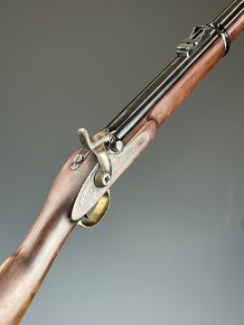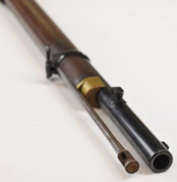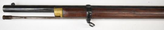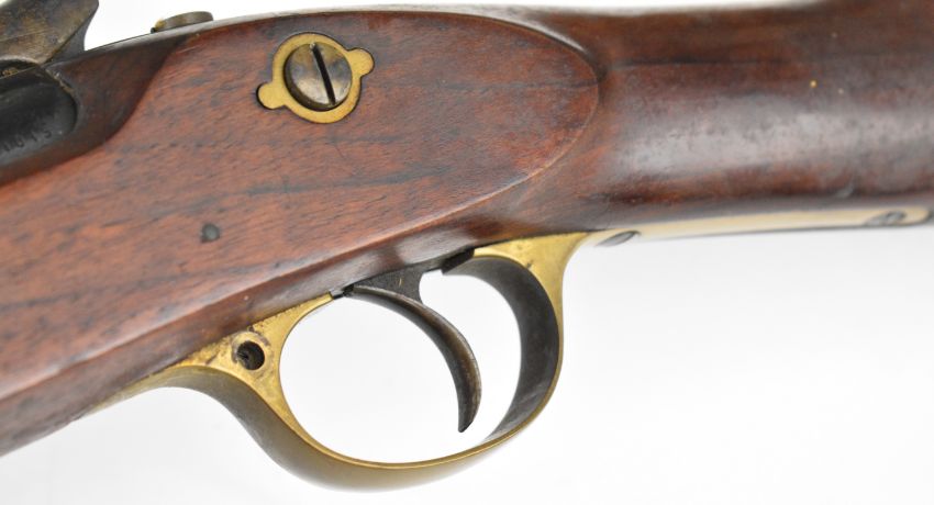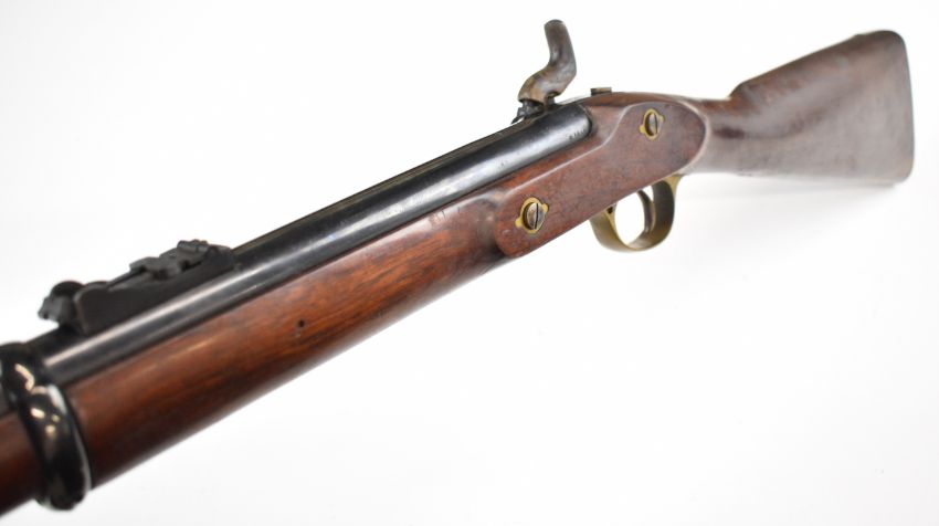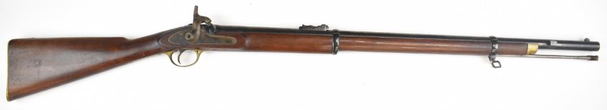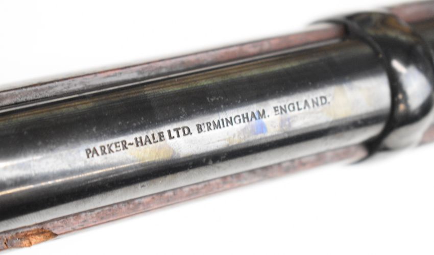 Parker-Hale Ltd .577 muzzle loading percussion hammer action rifle with 'Enfield 1858' and crown over 'P-H' cypher to the lock, brass trigger guard, butt plate and mounts, steel ram-rod, adjustable ladder sights and 33 inch rifled barrel, overall length 125cm, serial number S1015. PLEASE NOTE THAT A VALID RELEVANT FIREARMS CERTIFICATE IS REQUIRED TO VIEW OR PURCHASE THIS LOT AND FOR ALL SHOTGUNS OR RIFLES PLEASE ENSURE YOU HAVE THE RELEVANT CERTIFICATE BEFORE BIDDING.